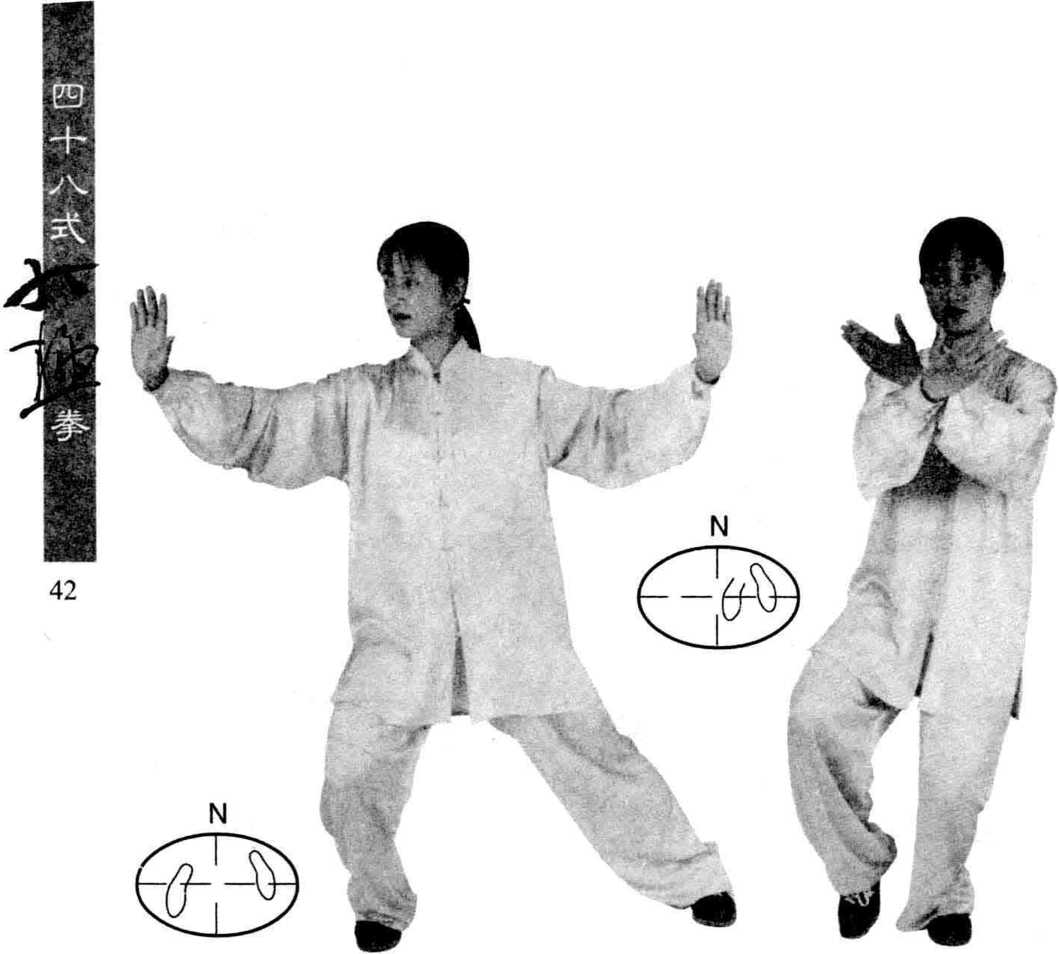 右掌经左腕上方伸出,两掌 左右分开,与肩同宽,掌心向 下;随即上体后坐,重心移至右 腿,左脚尖翘起;两臂屈肘,两 掌收至胸前,掌心向前下方。眼 平看前方。