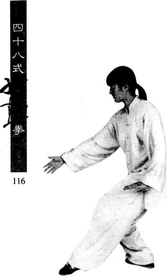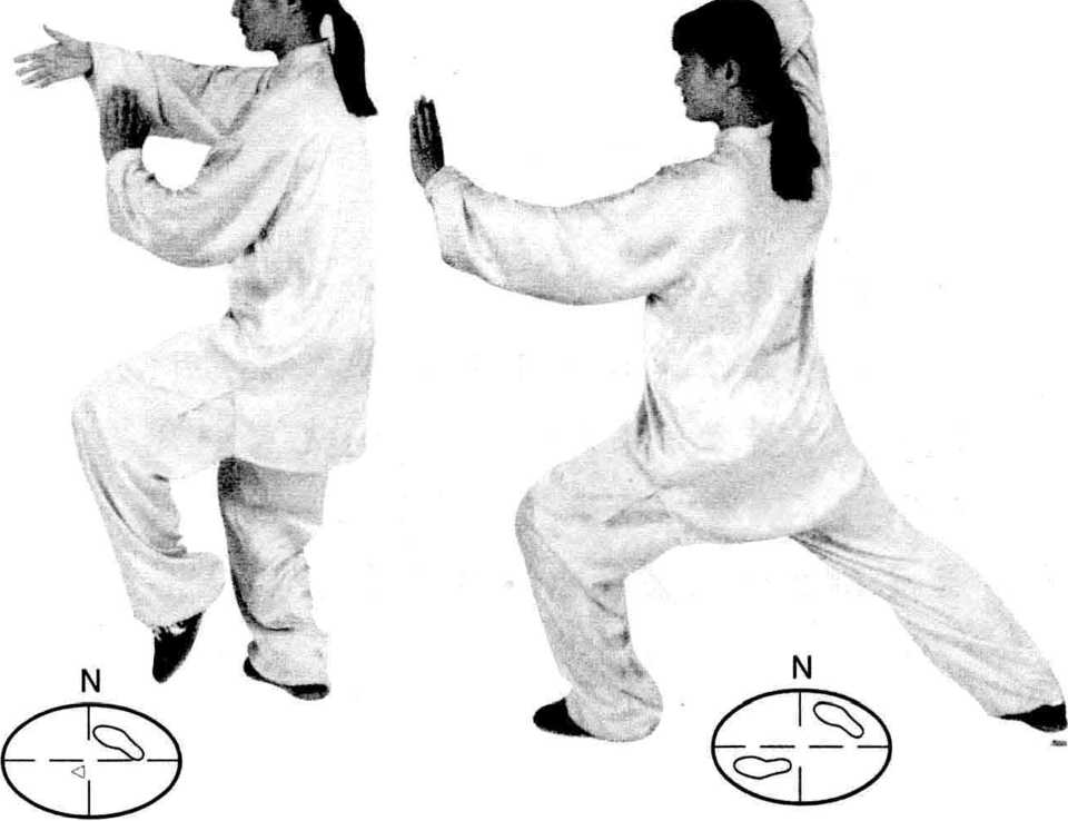 右脚跟进半步在左脚侧后方 落下,脚前掌先着地,然后全脚 踏实。上体右转,身体重心后移 至右腿,左脚轻轻提起左拳变 俯掌向左、向前划平弧右拳变 侧掌下落,经体右侧向上抽提 至右耳旁。眼看前方。