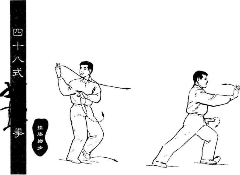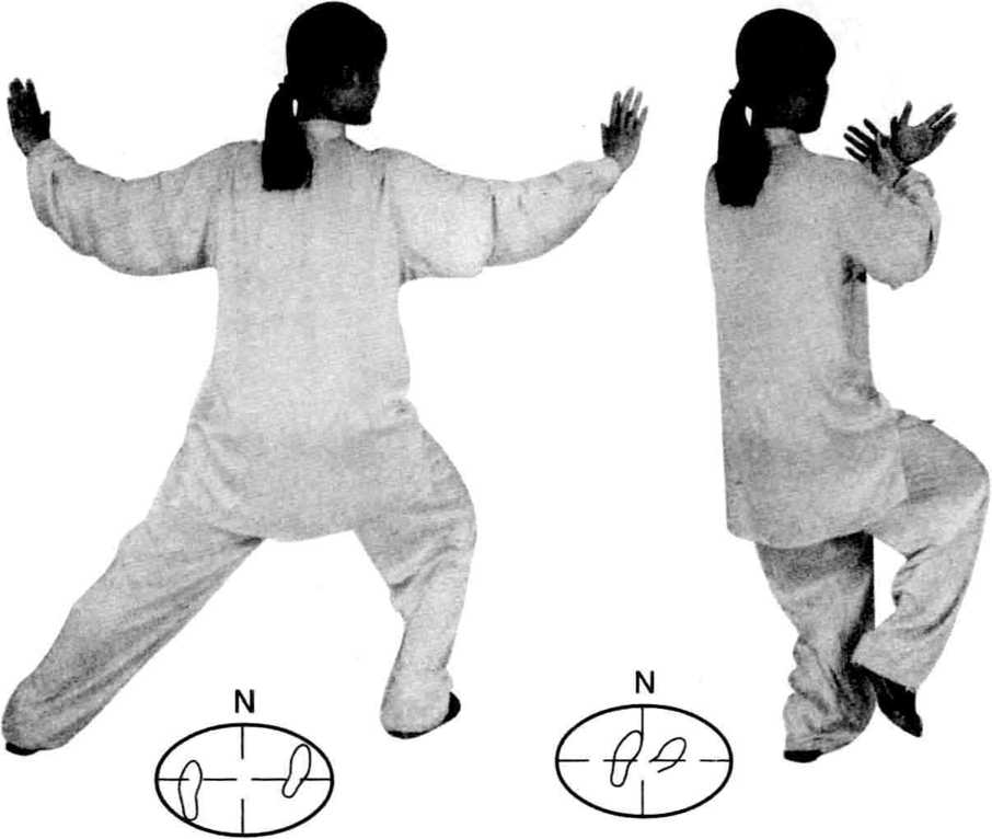(1)提手时,不要耸肩吊肘。(2)定势时,要向前、向下松腰。右 胯不要外敞。(3)弓步推掌过程中,左推、右翻、弓步同时完成,协 调一致。