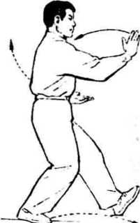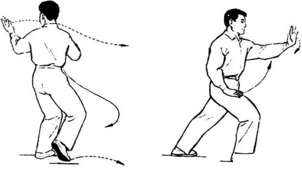 左脚前落,重心前移成左弓 步;右掌经面前翻掌上撑停于右 额旁,掌心斜向上,指尖向左左 掌经胸前向前推出,掌心向前, 高与鼻平。眼看左掌。