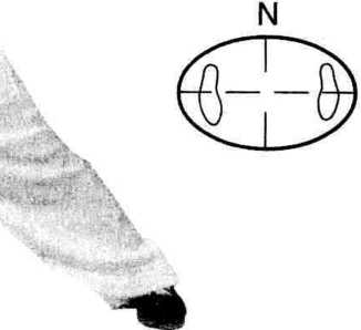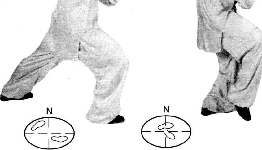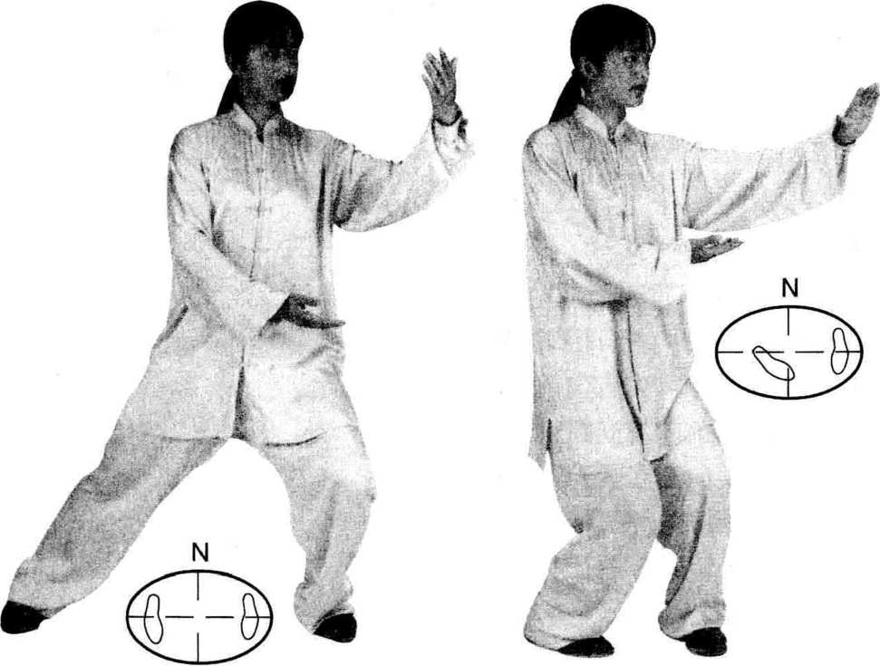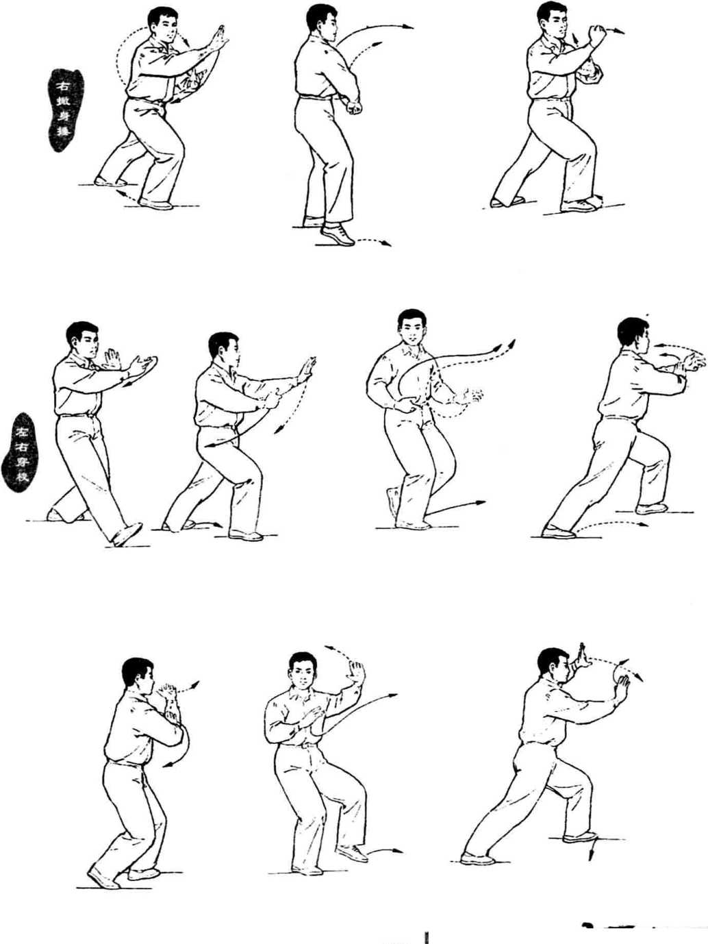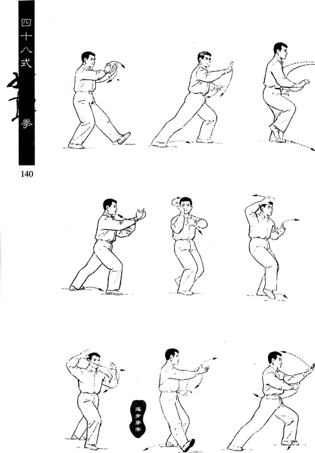 上体左转,重心移至左腿, 右脚收于左脚内侧(两脚相距 10 ~ 20厘米),脚尖皆向前;同 时左掌经面前向左立圆云转; 右掌经腹前向左立圆云转。云 至身体左侧时,左掌心转向 外,右掌心转向内。上体及视 线均随左掌转动。⑸上述动作再重复一次,唯 最后收并右腿时,右脚内扣 约45度。右般身捶一左右穿梭T退步先拿四十八式第34式右撇身捶
