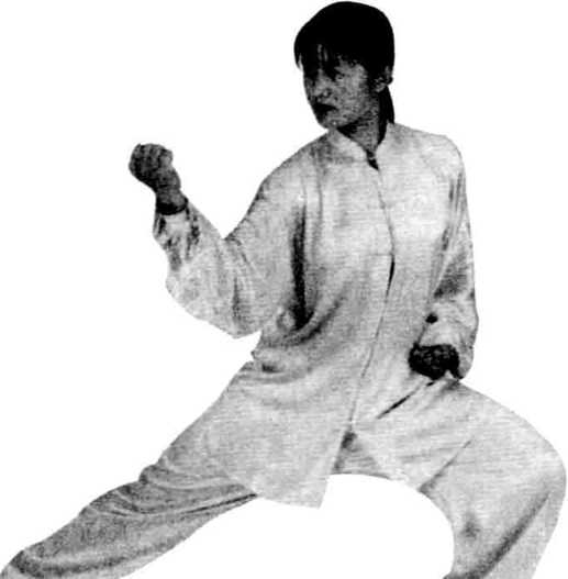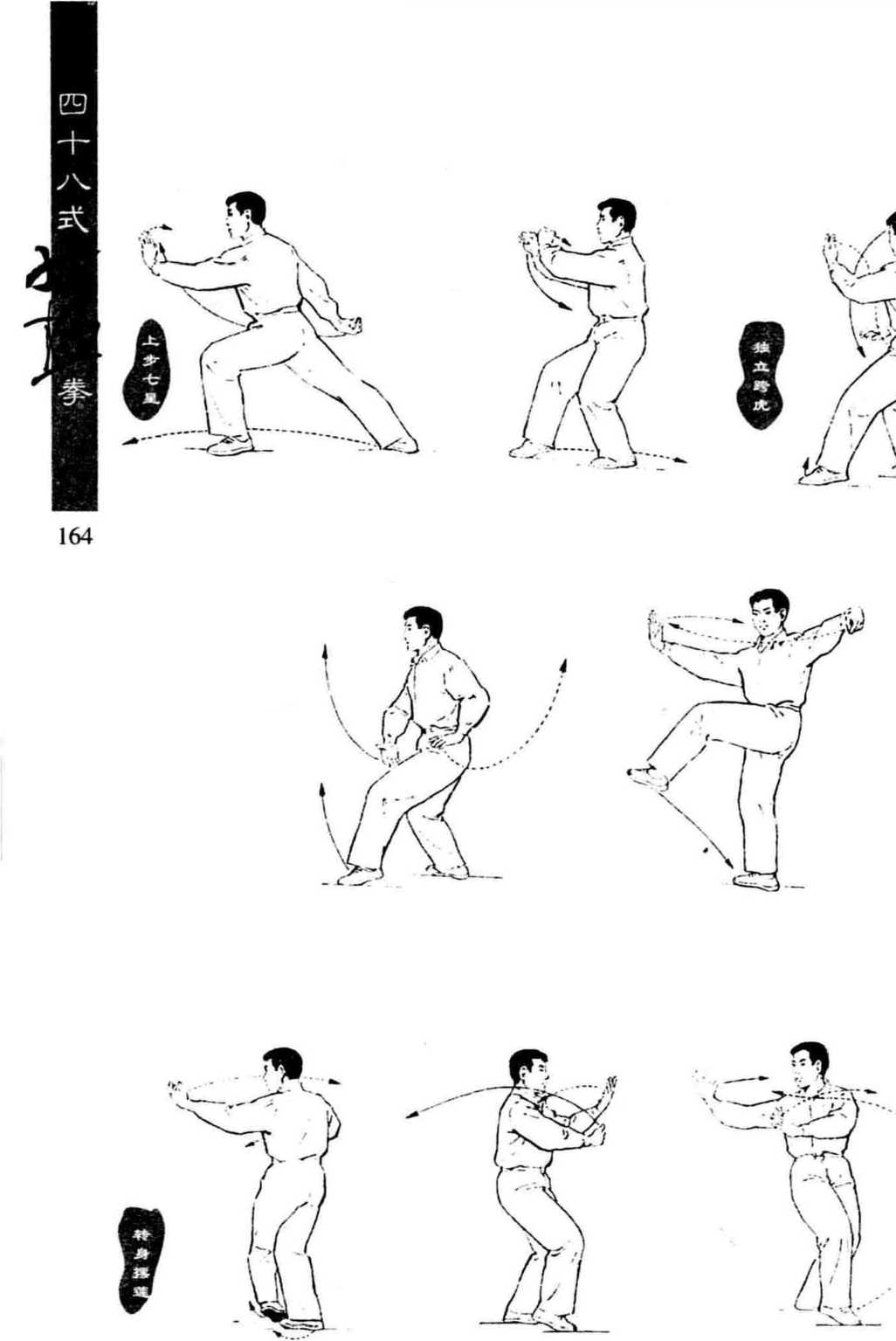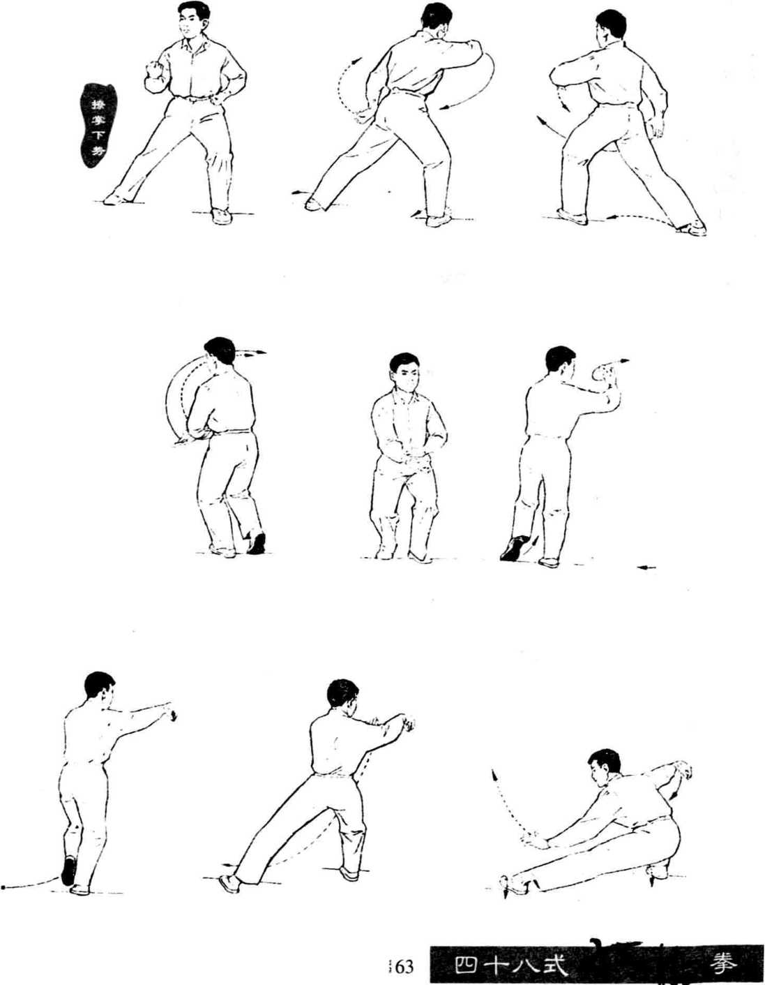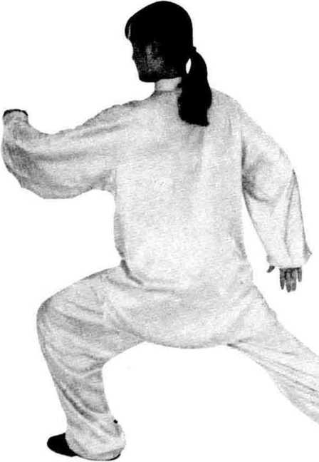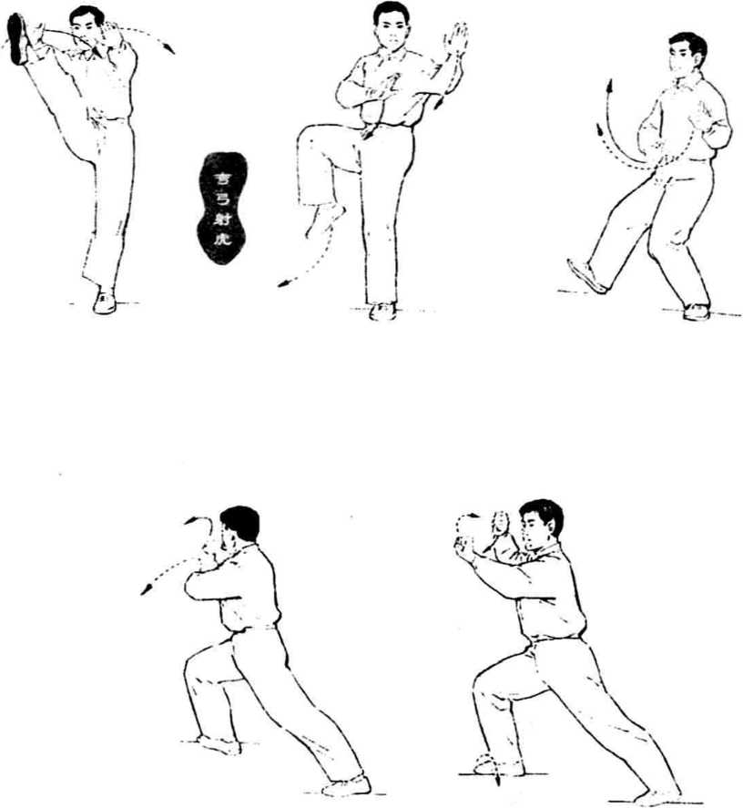 上体继续左转,重心移 向左腿,右脚跟外展成横裆 步;两掌随转体向左平捋, 同时逐渐握拳,然后松腰、 沉肩,左前臂外旋,左拳收 于左腰间,拳心向上,右前 臂外旋滚肘下沉,右拳高与 胸齐,停于体前,右臂半屈 成弧形,拳心斜向内。眼看 右拳。(正面图)擦掌下务一上步七星一? 独立咚虎一转身唇连T弯弓射虎166166第41式撩掌下势第41式撩掌下势166166第41式撩掌下势第41式撩掌下势