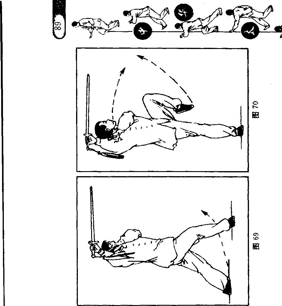 (1)右脚尖外展,身体略右转;同时右手持剑向右上方带剑 至头前上方(腕距右额约10厘米),手心向前,剑尖朝左,剑身平 直;左手剑指屈肘附于右小臂内侧,手心朝右;目视剑尖方向。 (图 69)