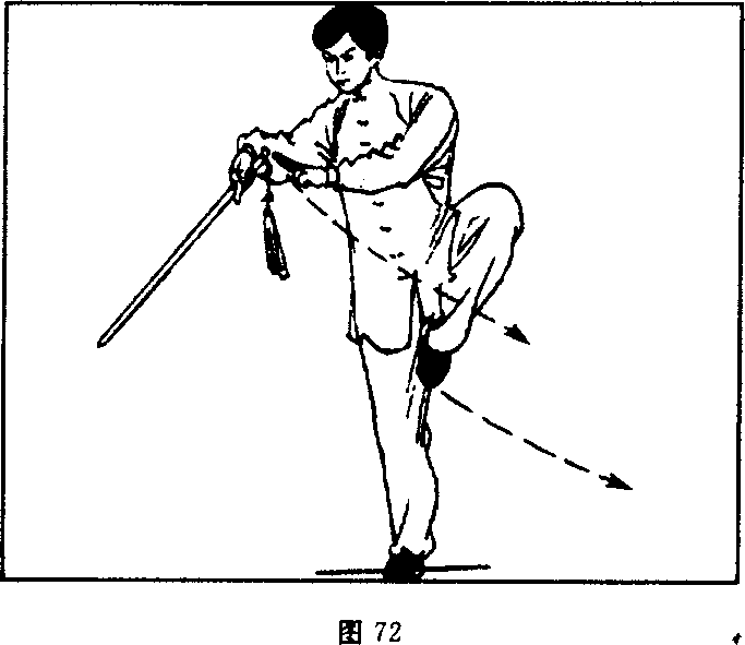 左胭屈膝成右独立步,上体略右转;同时右手握剑经上向右 前下方点剑,腕与胸高剑尖与膝同高:左手剑指屈肘右摆,附于 右小臂内侧,手心朝下;目视剑尖方向(图72)。