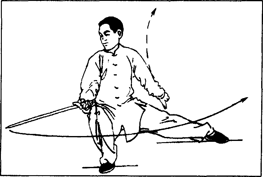(1)右腿屈膝全蹲,左脚向左后方落步成左仆步;上体略左 转,同时左手剑指屈肘内旋,经左肋前向后反插至左腿外侧,手 心朝外『右手握剑沉腕下落至右膝前上方,手臂自然伸直,手心 朝上,目视剑尖(图73)。