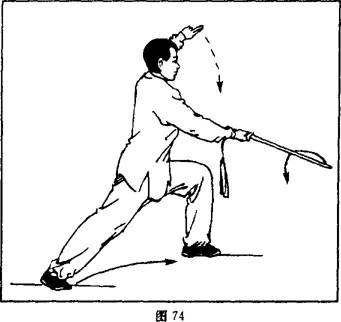 上,臂呈弧形举于头左斜上方,手心朝上;目视剑尖(图74)。