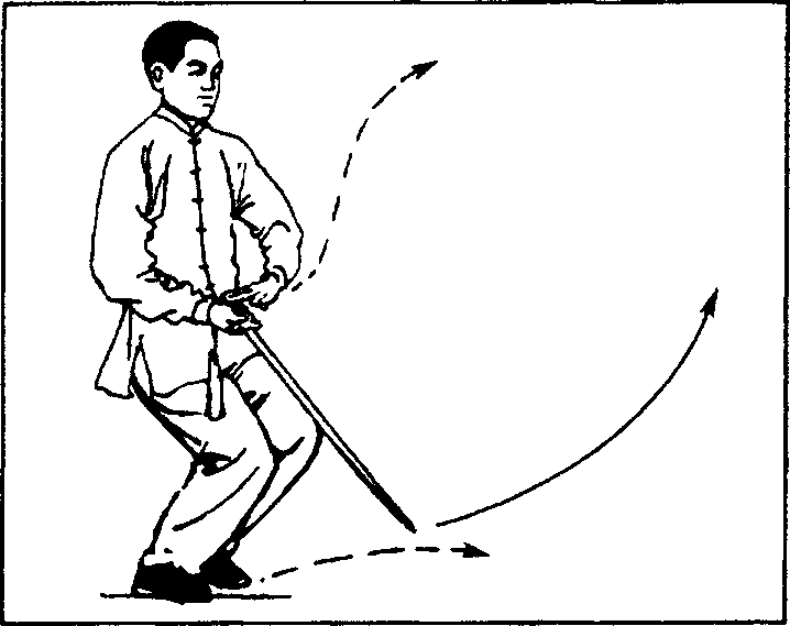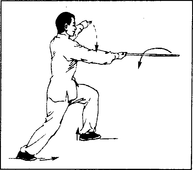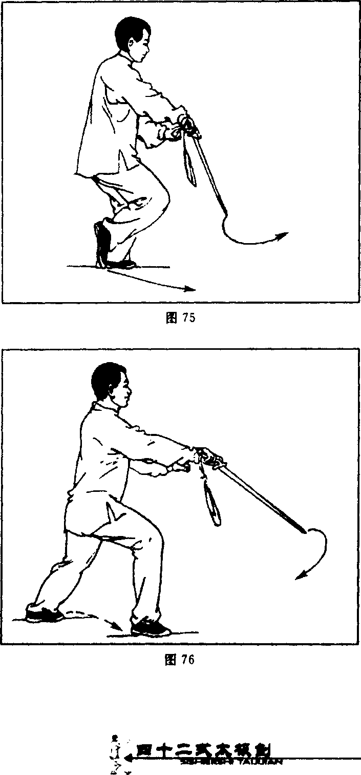 24 要点:划弧拨剑,以腕为轴,手腕松活,剑尖形成一小Bl弧。 截剑时以身带剑,身随步转。整个动作要81活连贯,眼随剑走。要点:划弧拨剑,以腕为轴,手腕松活,剑尖形成一小Bl弧。 截剑时以身带剑,身随步转。整个动作要81活连贯,眼随剑走。图78图78.弓步下剌式