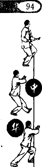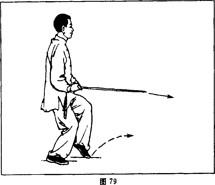 (1)身体重心前移,右脚在左脚后震脚,屈膝半蹲;左脚跟提 起,上体略右转:同时右手握剑屈肘回带至右肋前,手心向上,剑 尖朝前,略低于手;左手剑指先前伸;复随右手回带屈肘附于右 腕内侧,手心朝下;目视剑尖。(图79)