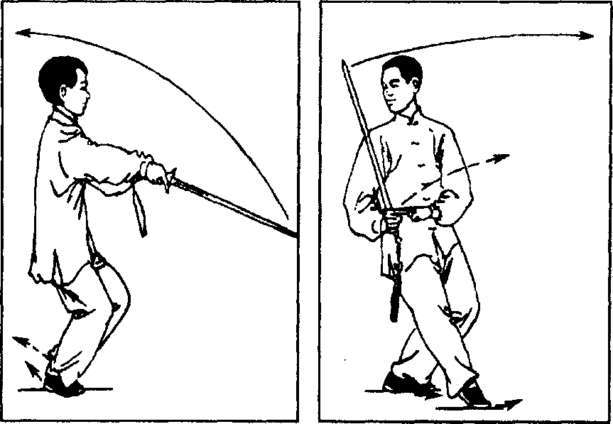 要点:插步转体时,上体不要过于前俯,也不要突臀;提膝与 上举剑要协调一致。此势为平衡动作。