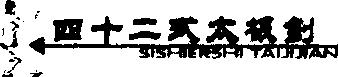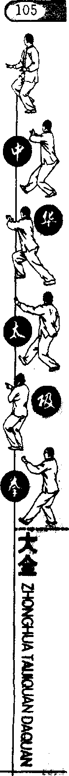 图95 图96图95 图96(2)左脚蹬地,随身体重心前移,右脚向右前方上步,脚尖内 扣,左脚跟清半步,两腿屈膝半蹲成马步;上体左转;同时右手握 剑向右前方立剑平推,腕同胸高,剑尖朝上,力贯剑身前刃;左手 剑指经胸前向左推举,手心朝外,指尖朝前,与肩同高;目视右 侧。(图97)