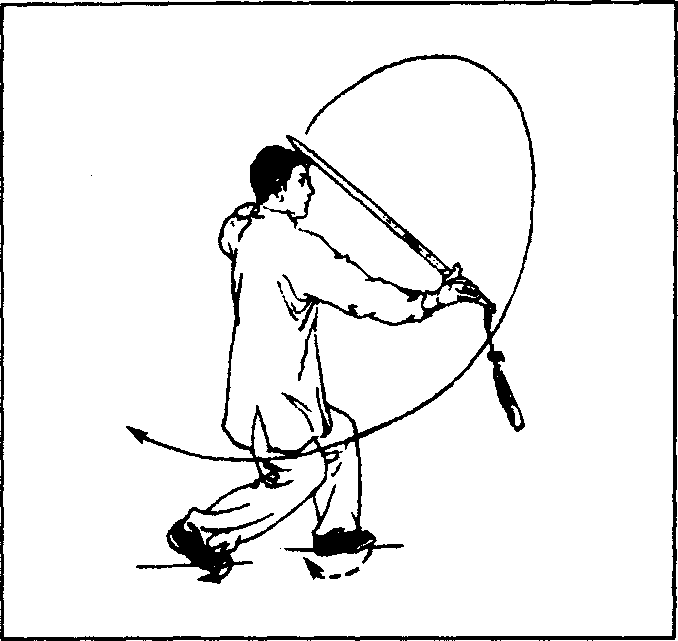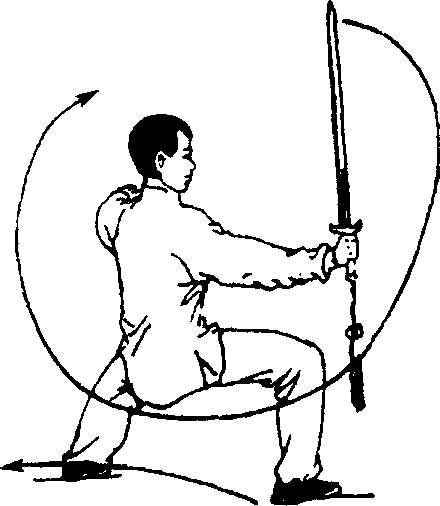 (2)随身体重心后移,两腿屈膝下蹲,并以左脚跟、右脚掌为 轴碾地,身体右后转(约180°);同时右手握剑,小臂内旋,剑柄领 先向下、向右后方划孤摆举至右膝前上方,剑尖朝前,左手剑指 屈肘向右附于右腕内侧,手心朝下,目视剑尖。(图99)