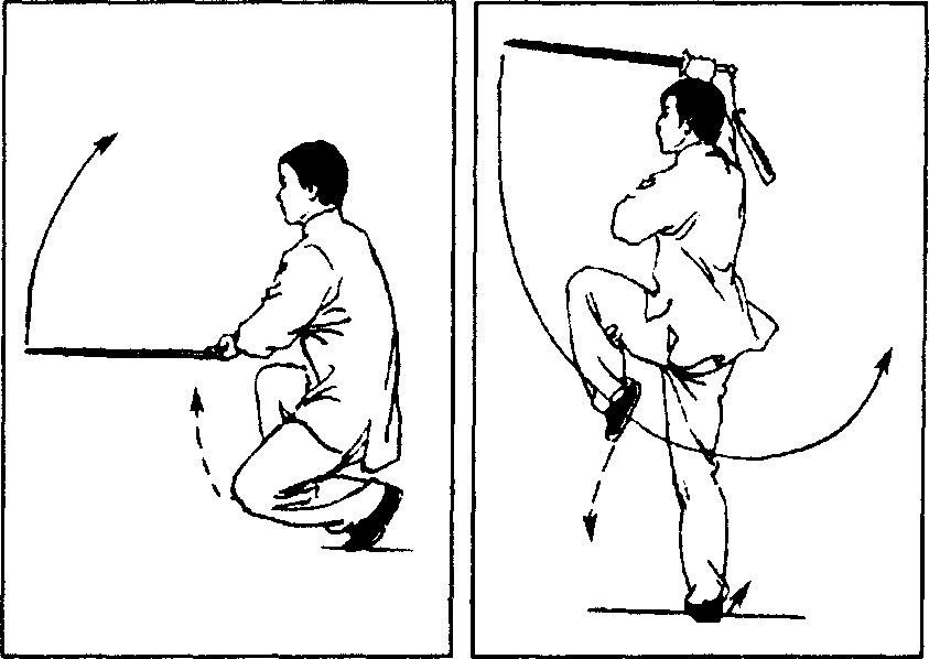 要点:歇步与崩剑动作要协调一致;沉腕崩剑,劲贯剑锋。