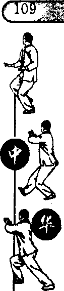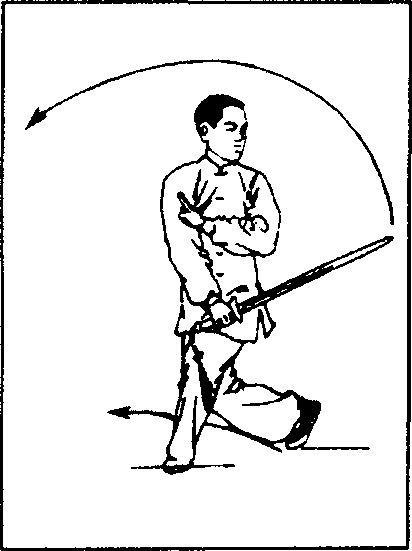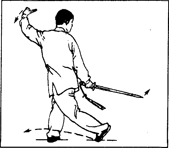 (1)左脚向左摆步,随身体重心前移,右脚跟提起,上体略左 转;同时右手握剑向左下方划弧挂剑,手心朝内,左手剑指屈肘 附于右上臂内便,手心朝外;目视剑尖方向。(图101)