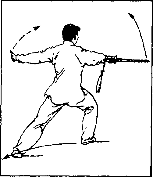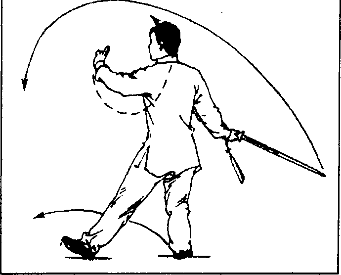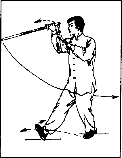 (4)随身体重心前移,左脚摆步向前,脚跟着地;身体略左 转;同时右手握剑向右伸举,手心朝上,腕同腰高,剑尖朝右下