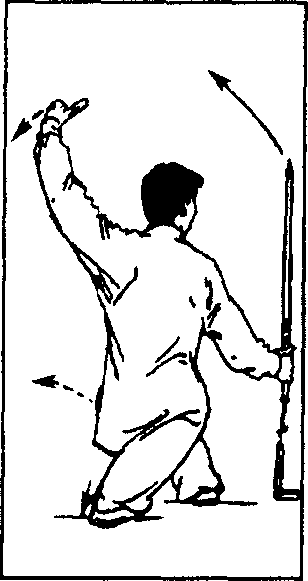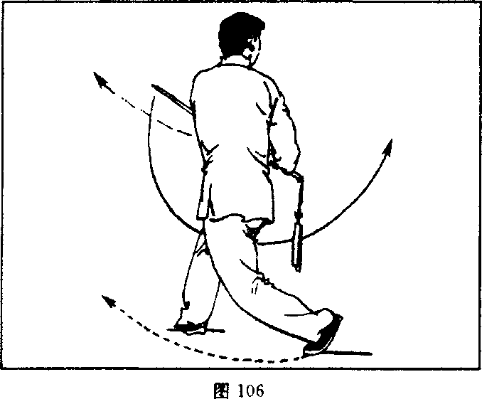 (1)右脚跟内扣踏实,屈膝半蹲;左脚跟提起,身体重心前 移,上体右转;同时右手握剑翘腕向后带剑至右胯旁,手心朝内, 剑尖朝左上方,略低于肩;左手剑指屈肘下落附于右腕上,手心 朝下;目视右前下方。(图106)