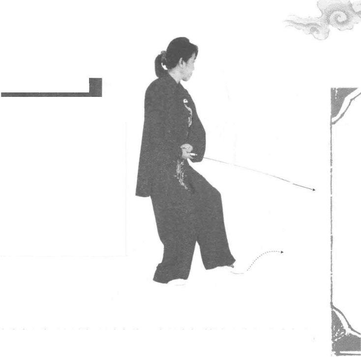 9 肘回带至右肋前,手心朝上,剑尖朝前,低于手;左剑指下落,先前伸,后随 右手屈肘回带,手心朝下。目视剑尖。