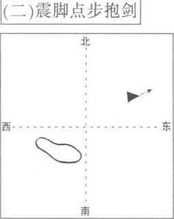 重心前移,提右脚在左脚内侧。同时上体微右转(约30。),右手握剑屈