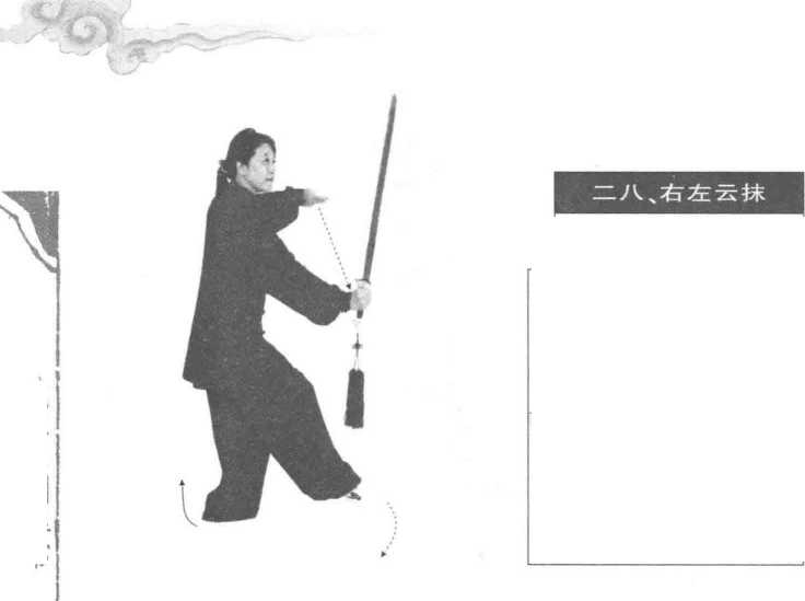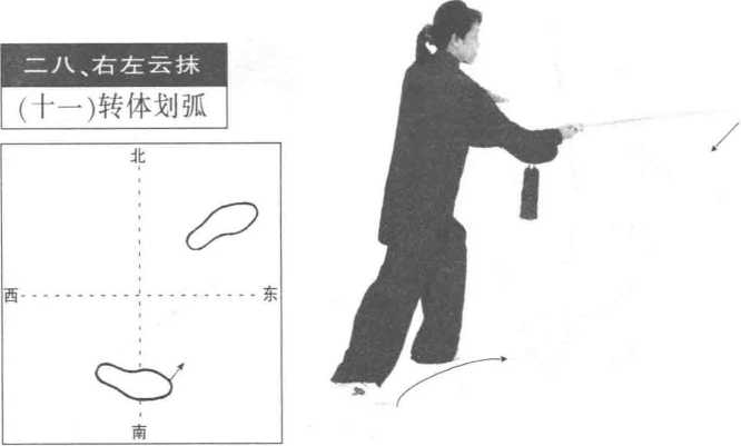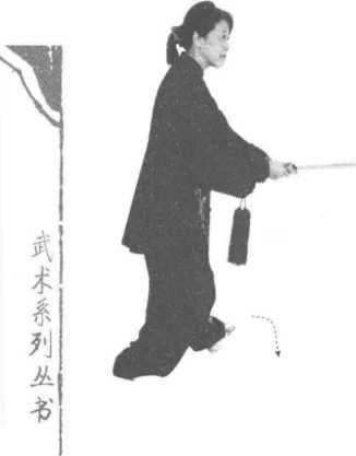 移重心与左转划弧须上下协调一致,同步到位。持剑的臂不要太直。