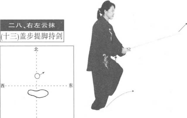 右脚盖步和提左脚应同时完成,盖步 要轻灵,剑随腰转于腹前应与下肢协调 配合。盖跳步不要太高,要沉稳,要求在 左脚前落步。上体不要前倾、凸臀。