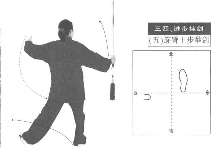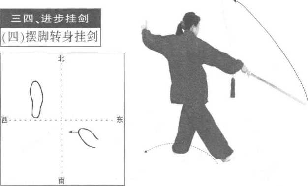 左腿自然伸直,提左腿跟,上体右转(约90。)。同时 右手握剑向下向右后挂剑;左剑指向前划弧,分开屈臂至头前。目视右方。