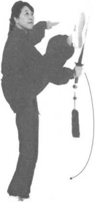 攻防用意:设对方向我头前刺来一剑,我即用剑引架而后用剑旋腕绕 圆,格开来剑,同时用腿法摆踢对方面部和头部。