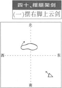 当右手握剑左摆至面前时,重心前移,左腿自然直立;右脚向左向上向 右外摆腿。同时右手握剑前臂内旋,经面前使剑尖在头前上方逆时针向右 云摆;左剑指在左侧方,手心朝外。目视剑尖。