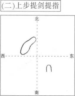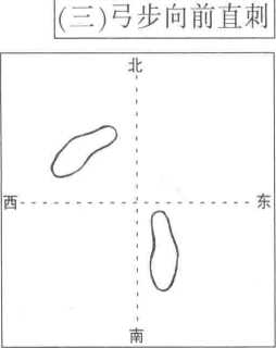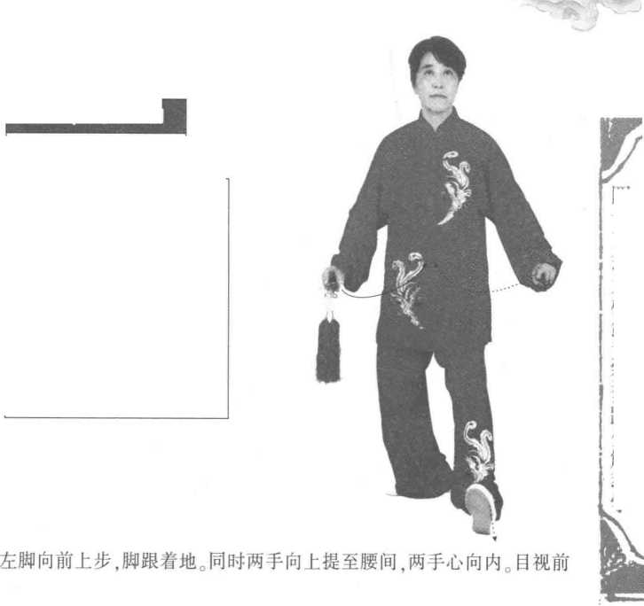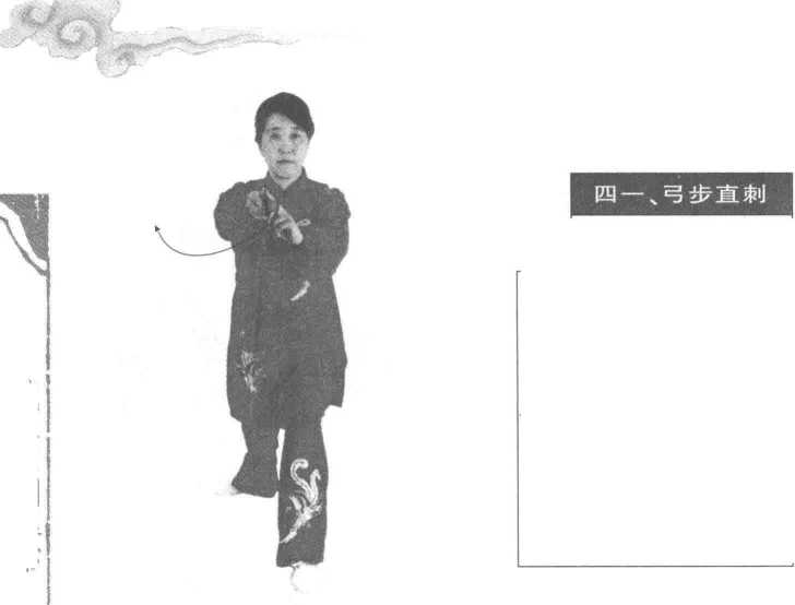 武术系列丛书4重心前移,左脚掌踏实,屈膝半蹲;右腿自然蹬直,成左弓步。同时右手 握剑立刃向前直刺;左剑指在胸前与右手相合,附于右腕内侧后向前伸送, 手心斜向下。目视前方。200 弓步与刺剑要协调一致,身体要自然直立。不要挺腹、凸臀。上步时不要塌腰。移重心为吸气,弓步刺剑为呼气。攻防用意:设对方向我身前击来,我即以剑刺向对方胸部。四卜:式花幅竞赛套路分解数存