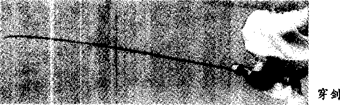 穿剑平剑,从 右向左侧后或向后立 剑穿出,高度在胸腹 或膝下之间穿出,力 达剑身。