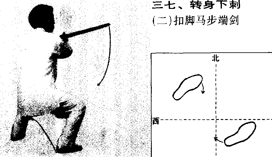 扣脚屈膝与回带剑须协调一致,同步到位。马步端剑上下 要配合协调。此马步不要太低,是过渡动作,脚尖不要外摆,更 不要塌腰、突臀、耸肩。