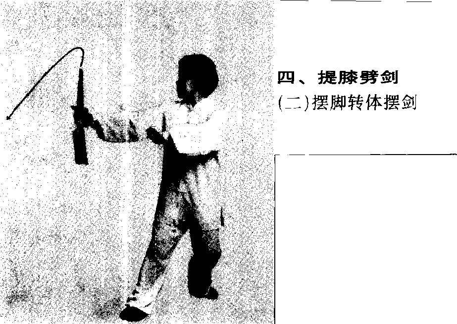 (一)后移平带指左腿屈膝,重心后移,上体微右转,右脚尖翘起。同时两臂 划弧平摆,右手持剑,手心向上,腕同肩高;左手剑指向前向右划 弧摆至右肩前,手心斜朝下。目视剑尖。剑随身转,要摆平。后坐带剑转体为吸气。设对方从我后方偷袭,我即将剑向后拔带以御之。右脚外摆,上体继续右转°同时右手握剑屈肘向右后方摆 剑,手心向上,腕略高于胸。目视剑尖方向。摆脚与转体摆剑要协调一致,左手划弧也要与转体配合。不要凸臀、收腹、直腰、挺胸。转体摆剑上提为呼气。设对方从侧前攻来,我即用剑上抬格挡。