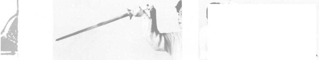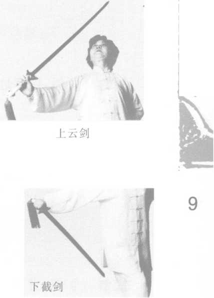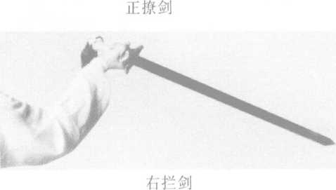 削剑 平剑,自对侧下方经胸前向同侧 前上方斜出,手心斜向上,剑尖略高于头。