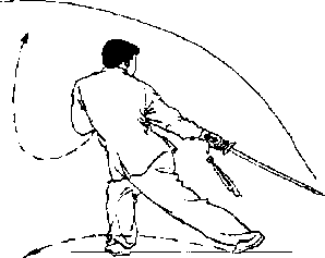1.随重心前移,右脚向前摆步,屈膝半 蹲;左腿日然伸直,脚跟提起,上体右转;同 时右手握剑向右后方F截;左手剑指屈肘向F 附于右肩前,手心斜朝下;目视剑尖(图51.51 附)。