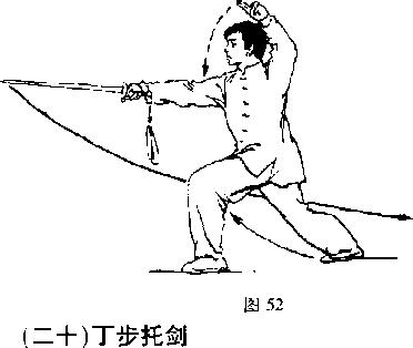 侧.脚尖点地成左丁步;同时E匕\ I 右手握剑,屈肘向前、向上托 j I