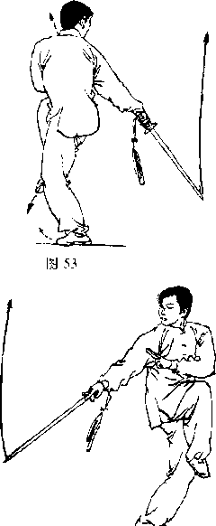 剑:尖手剑指屈肘摆至右肩前,手心朝扣后; 目视剑尖(图53、53附)°