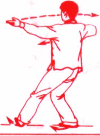 上体继续右转约90°,直至与(三十七)式相背.重心落于左 腿,右脚前掌虚点地,右掌经胸前,左肘侧向左穿出后再向右划 弧,掌心斜向右前方,指尖向上,腕与肩平;左掌向面前翻转下落 于右肩侧,掌心向右;眼看右掌。(图171)