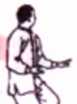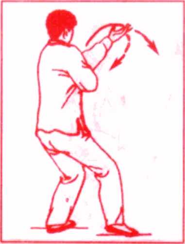 以两脚掌为轴,向右后方转身约90°.左臂经面前平摆划弧, 半屈肘停于体左前方,掌心向上,指与头平,右掌翻转向上停于 胸前;头随体转,眼看左掌。(图170)