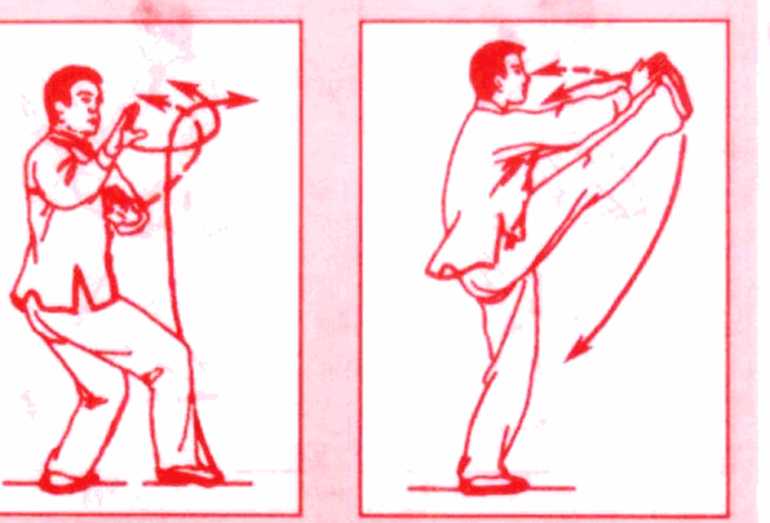 右小腿下落,屈膝提于体前.脚尖下垂,成左独立式,上体左 转,两掌拍脚后继续向左摆至左肩前,掌心向下,高与肩平;眼看 左掌。(图173)