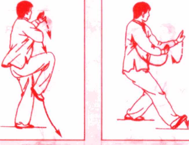 图173 图174图173 图174右脚向右前方落步,脚跟着地,上体右转,双掌同时向左下 方划;眼看左掌。(图174)