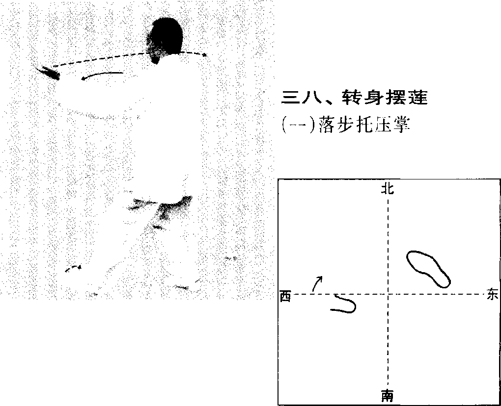 转体、落脚、摆掌应协调一致,同步到位。注意以腰带臂、平 带掌。左脚前落要轻,右腿微屈,重心偏右腿。上体保持中正。