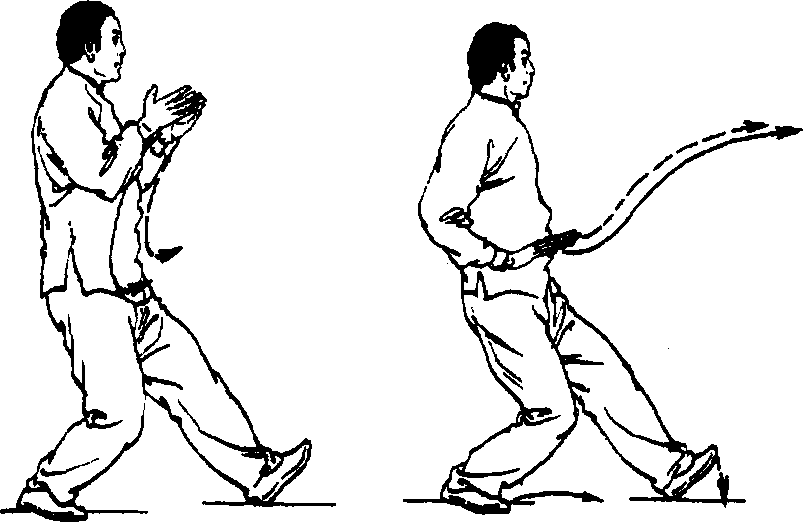 ① 左掌从右前臂下穿出,掌心向上,右拳随 之变掌,掌心也转向上(图10①)。图10? 图10③② 上体后坐,重心后移,左脚尖上翘;两掌 分开并屈臂内旋,收至胸前,与肩同宽,掌心斜 相对(图10②)。③ 两掌翻转向下,落至腹前;目视前方(图 10③)。图10④
