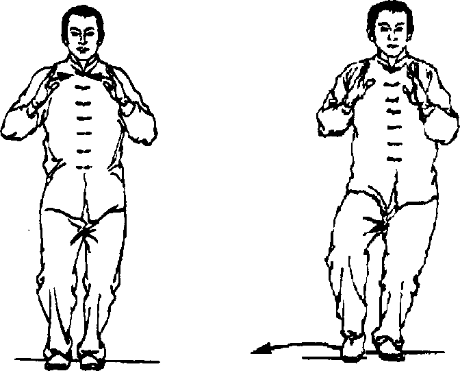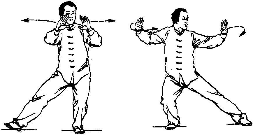图11① 图11②11.开合手① 以右脚掌、左脚跟为轴,依次向右碾转, 两脚踏实;两掌翻转,掌心相对,指尖向上,屈 收至胸前,两掌左右分开,与肩同宽;目视前方 (图11①)。② 重心移向左腿,右脚跟提起;同时,两掌相 合,与头同宽,掌心相对;目视两掌中间(图11②)。图12②图12②图12①图12②图12②