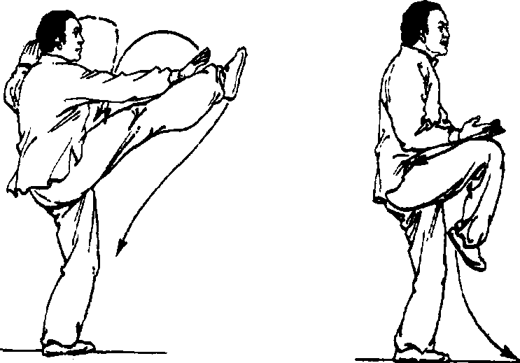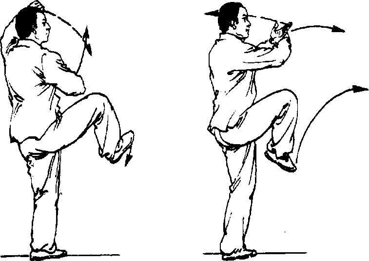 ③ 两掌逐渐握拳,左拳经体侧屈臂上举至左 额前上方,拳心向外,拳眼斜向下,右拳屈臂收 于左胸前,拳心向内,拳眼朝上;左腿微屈站 稳,右腿屈膝提起,右脚收至裆前,脚尖上翘并 内扣;头转向右前方,目平视前方(图20③)。