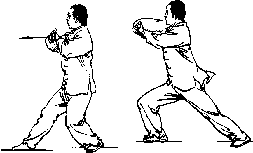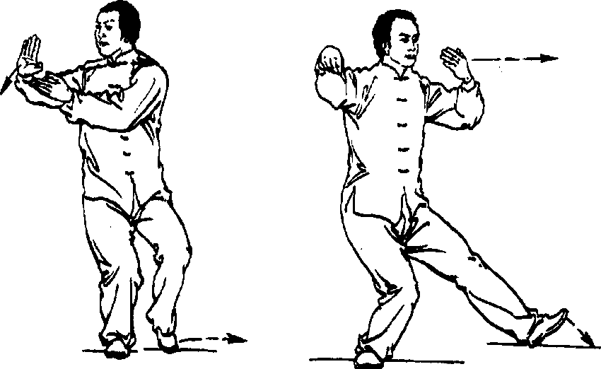 ?上体微右转,重心右移,左脚收至右脚内 侧,脚尖着地成丁步;右臂内旋,右掌翻转向右 前方立掌按出,腕高与肩平,掌心向外;左掌随 之翻转向内,指尖仍附于右腕内侧;目视右掌 (图2?)。