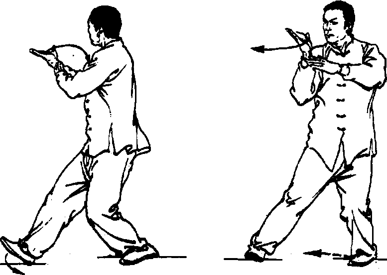 ?重心后移,上体微右转,右脚尖上翘;右 臂外旋,右掌心翻转向上,自前向右、向后屈肘 划平弧至右肩前;左掌仍附于右腕内侧随之划 弧;目随右掌(图2?)。