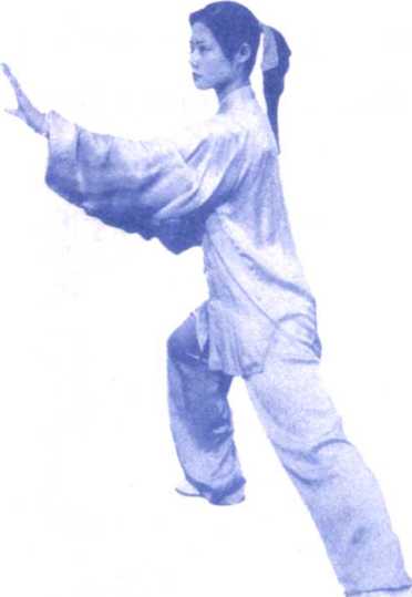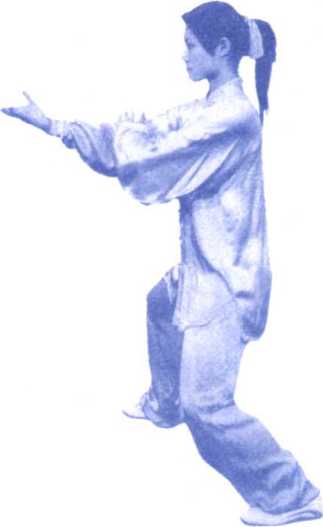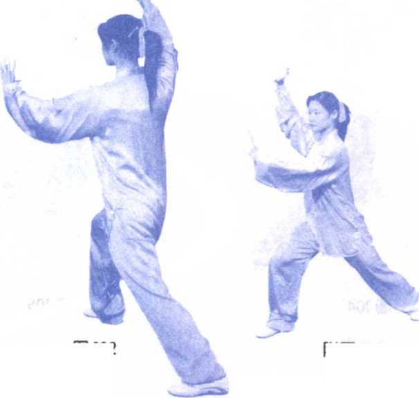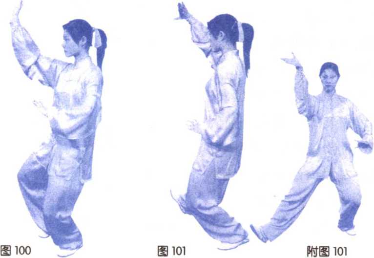 肩前上方,掌心斜向上,左掌随之划弧后收于左腰际;目视前方。肩前上方,掌心斜向上,左掌随之划弧后收于左腰际;目视前方。(图 100、101 附图 101)(图 100、101 附图 101)