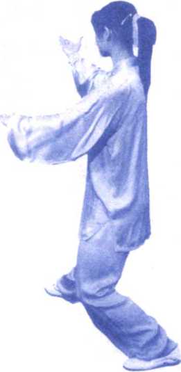 肩前上方,掌心斜向上,左掌随之划弧后收于左腰际;目视前方。