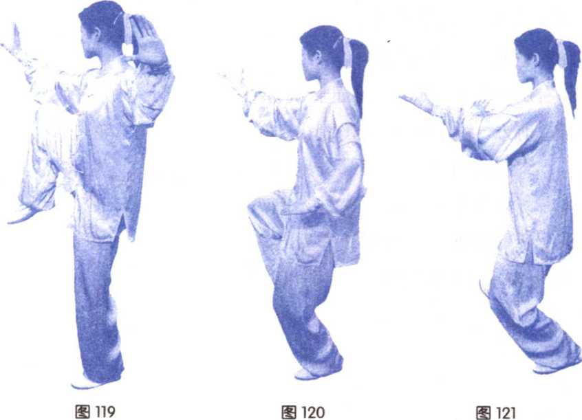 右脚向右前方落下,脚跟着地;右前臂外旋,右 掌心转向上,稍向内收,左掌下落,经腰间向前、向上划弧伸至 右肘内侧,掌心向下;目视右掌。(图119、120、121)