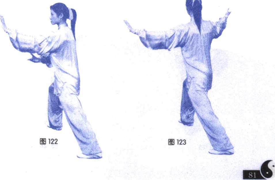 ⑥重心前移,右脚落实,上体右转,左掌从右前臂上方穿出 向上、向左划弧展开,右掌向下、向右划弧至腰侧,头随上体转 动。(图 122、123) 一