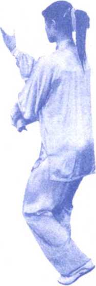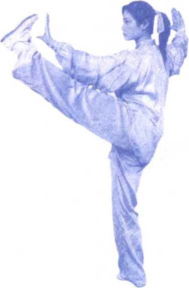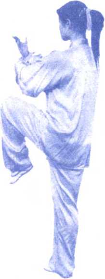 ⑧右腿微屈站稳,左腿屈膝提起, 左脚向左前方(约30度)慢慢蹬出,脚 尖上勾,脚跟高过腰部,两掌分别向左 前方和右方划弧分开,掌心向外,腕高 与肩平,两臂伸展,肘微屈,左臂与左 脚上下相对;目视左掌。(图125、 126)