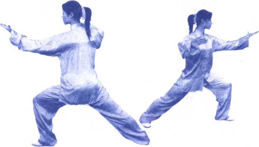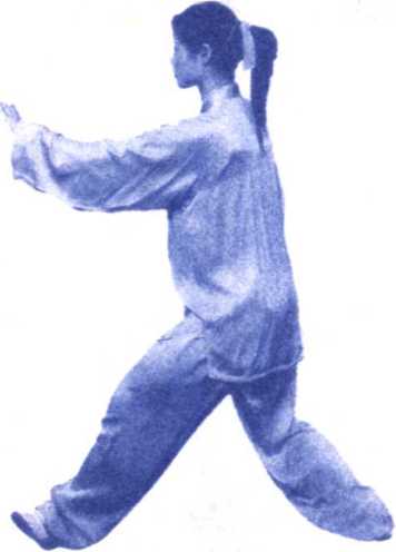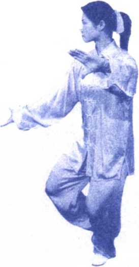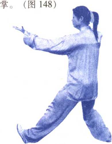 重心前移,成左弓步;左掌向前穿靠,掌 心向上,指尖向前,右腕高与肩平,右掌撑至身体右方,掌心向 外,指尖斜向上,腕高与肩平;目视左掌。(图146、147 附图147)
